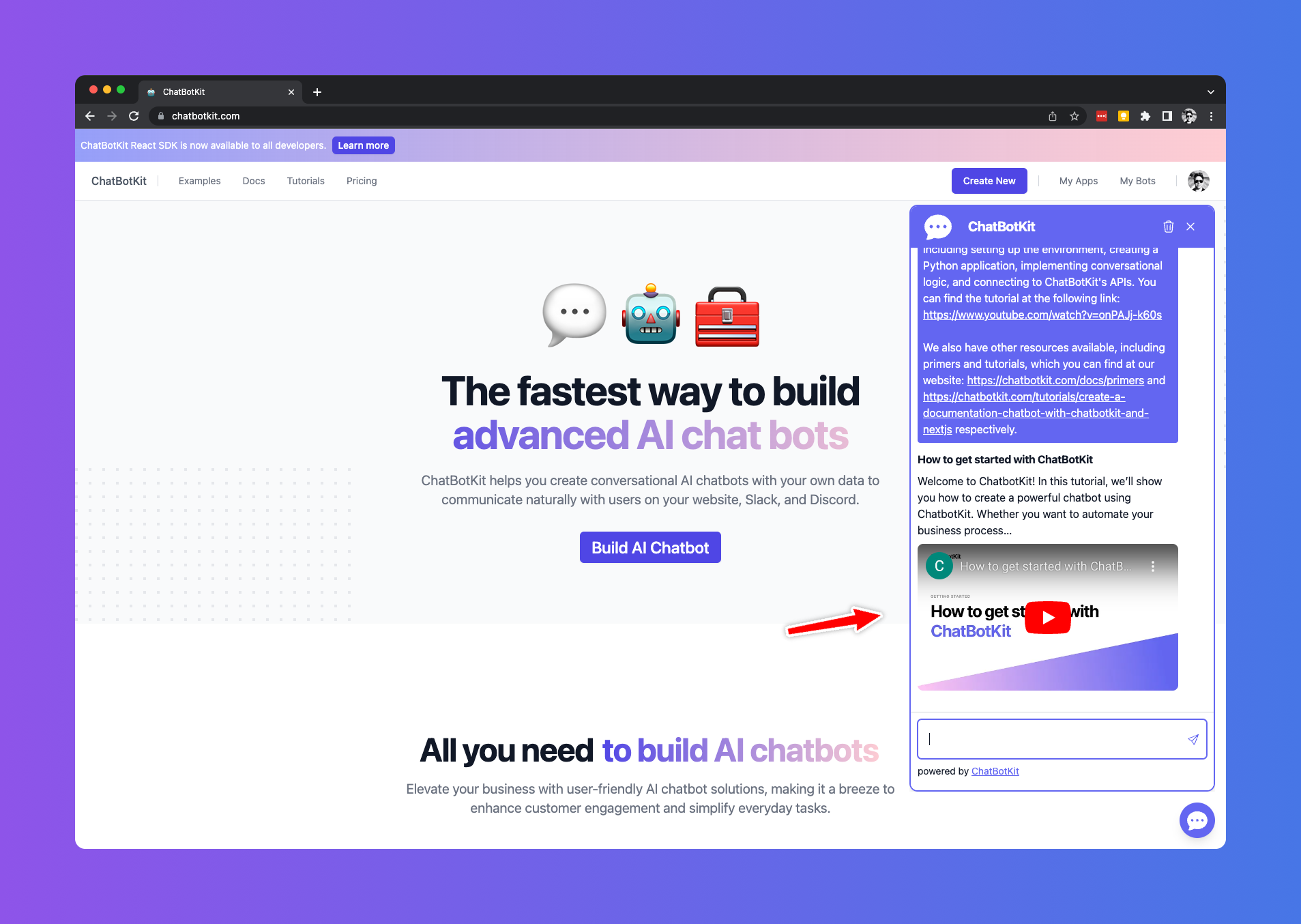 Whenever a chatbot shares a link, the ChatBotKit Widget will automatically unfurl the link with extra details. This process allows for rich content to be embedded directly into your chatbot, including YouTube videos, Twitter posts, blog posts, and even e-commerce data.