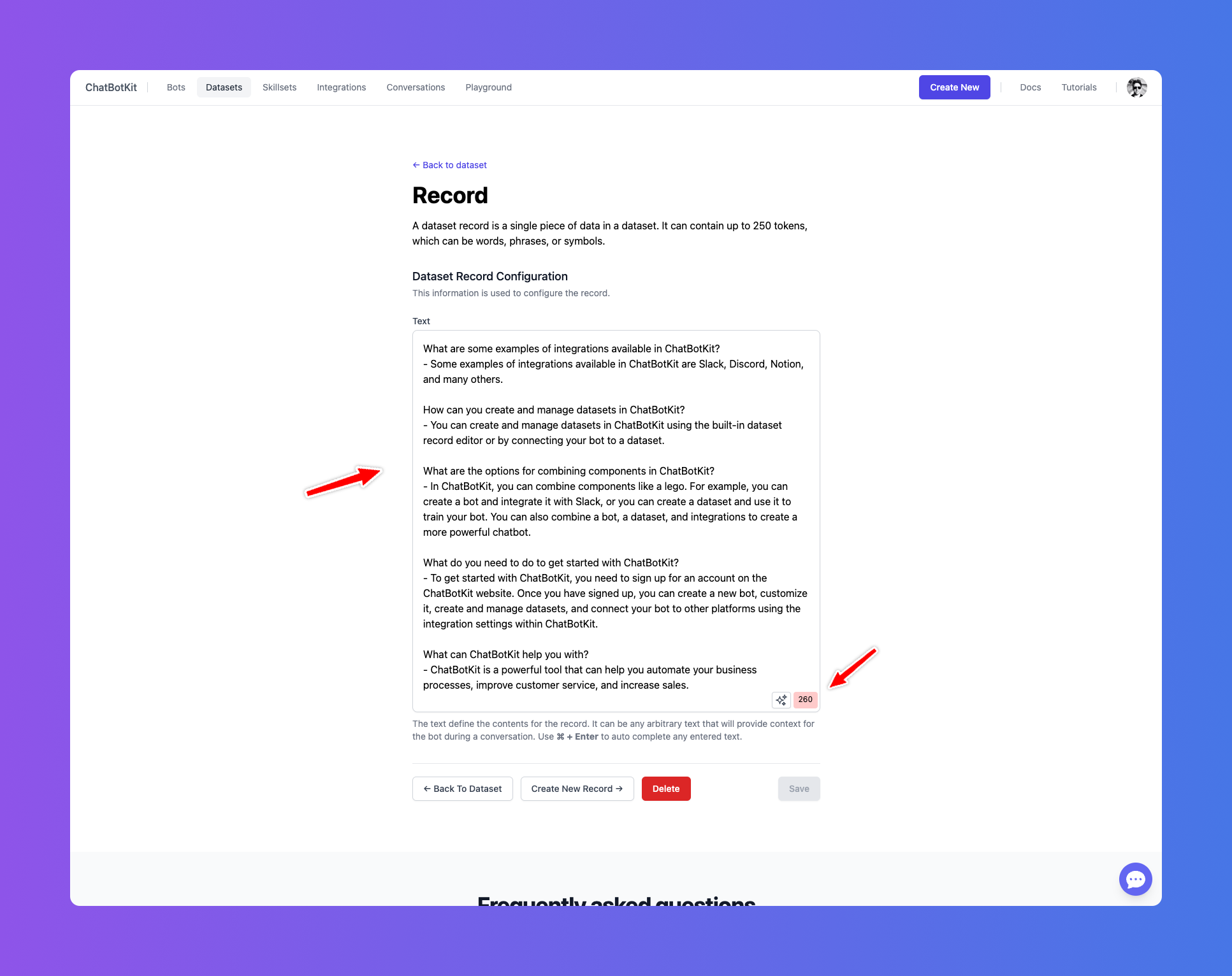 We are excited to announce that the ChatBotKit Dataset Records can now be automatically transformed to FAQs Records. This new feature allows you to split out your data into frequently asked questions that are most likely to be answered by the chatbot. This results in a higher quality of chat conversations and a better overall user experience.