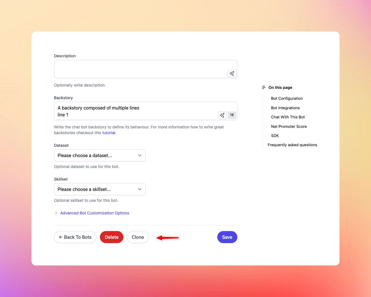 At ChatBotKit, we understand that the ability to adapt and innovate is crucial in today's fast-paced digital environment. That's why we continuously strive to provide our customers with the tools they need to stay ahead of the curve. The Clone Bot Button is the latest in a series of features designed to enhance the user experience and streamline the process of managing and testing AI bots.