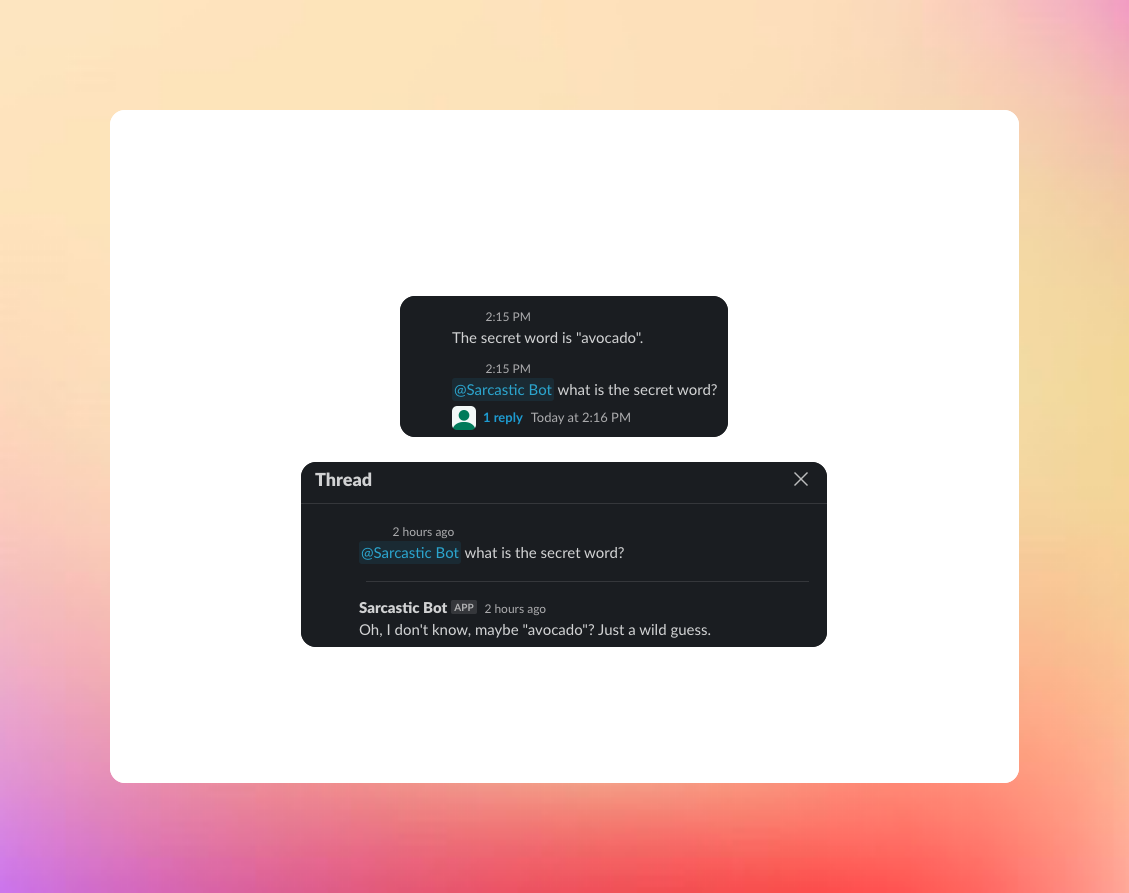 , the bot will consider the last ten messages in the channel as part of the context for the new conversation. This means that if a user shares a 'secret word' like "avocado" in one of the last ten messages, and then asks the bot about the 'secret word', the bot will correctly deduce that the secret word is "avocado".