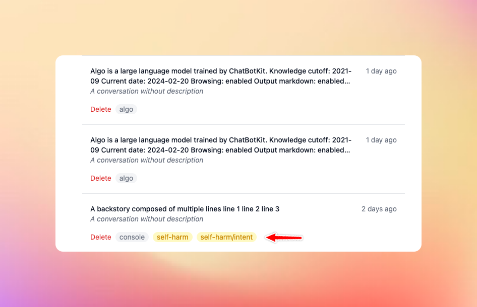 These new features are particularly useful for identifying and addressing problematic conversations swiftly. Whether a conversation involves abusive behavior or signals potential self-harm, the enhanced Conversations Screen allows for quicker detection and response. This not only improves the overall user experience but also contributes to the safety and wellbeing of users interacting with our AI solutions.