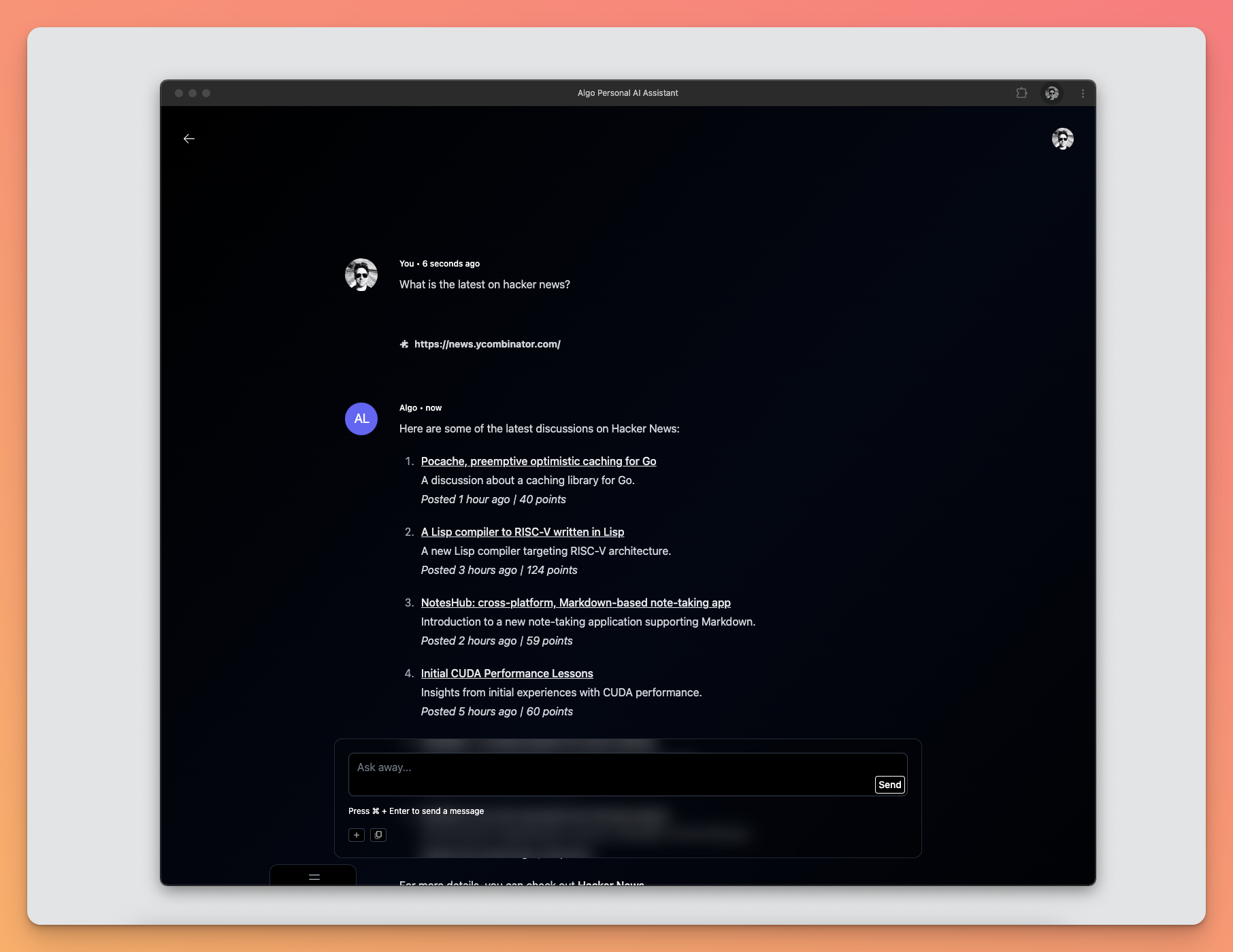 At the core of Algo's capabilities is its intelligent information retrieval system. Users can simply ask Algo for any information, and if necessary, it will fetch the required data from the internet in real-time or perform actions on behalf of the user. This feature sets Algo apart from its competitors, providing users with instant access to a vast repository of knowledge.