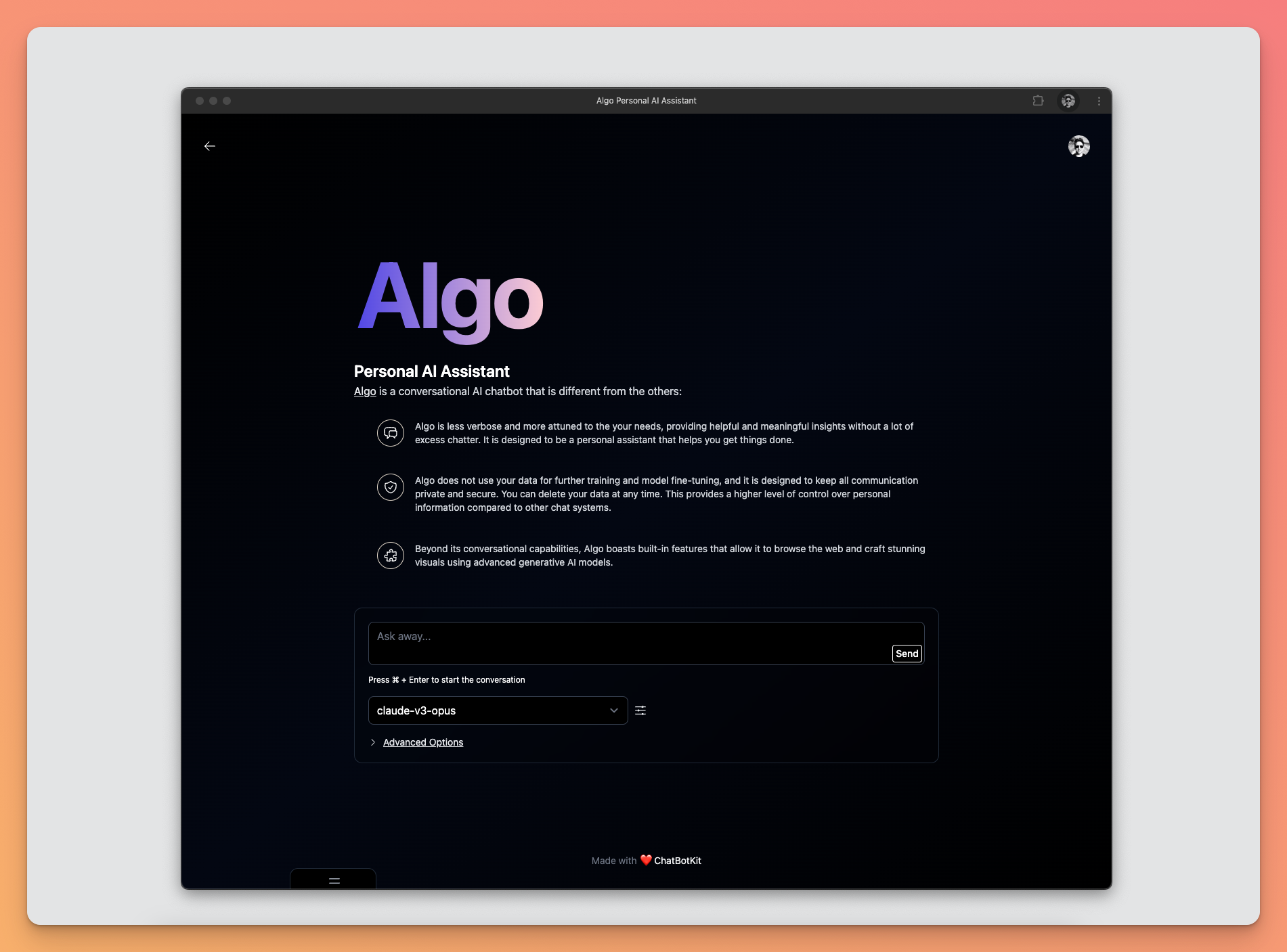 We at ChatBotKit are committed to pushing the boundaries of AI technology, and Algo Version 2 is a testament to our dedication to delivering exceptional AI-powered solutions. With its expanded model selection, reimagined user interface, enhanced progressive web app, and intelligent information retrieval capabilities, Algo is now an unrivaled, cutting-edge assistant that empowers users to achieve more than ever before.