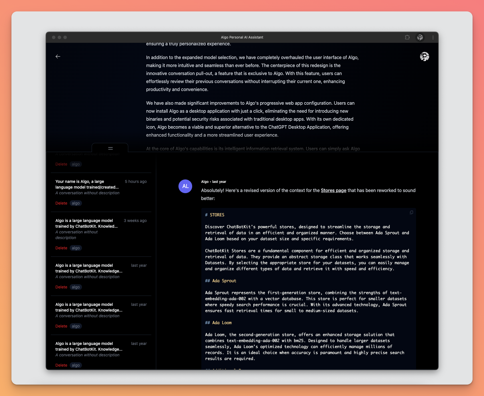 In addition to the expanded model selection, we have completely overhauled the user interface of Algo, making it more intuitive and seamless than ever before. The centerpiece of this redesign is the innovative conversation pull-out, a feature that is exclusive to Algo. With this feature, users can effortlessly review their previous conversations without interrupting their current one, enhancing productivity and convenience.
