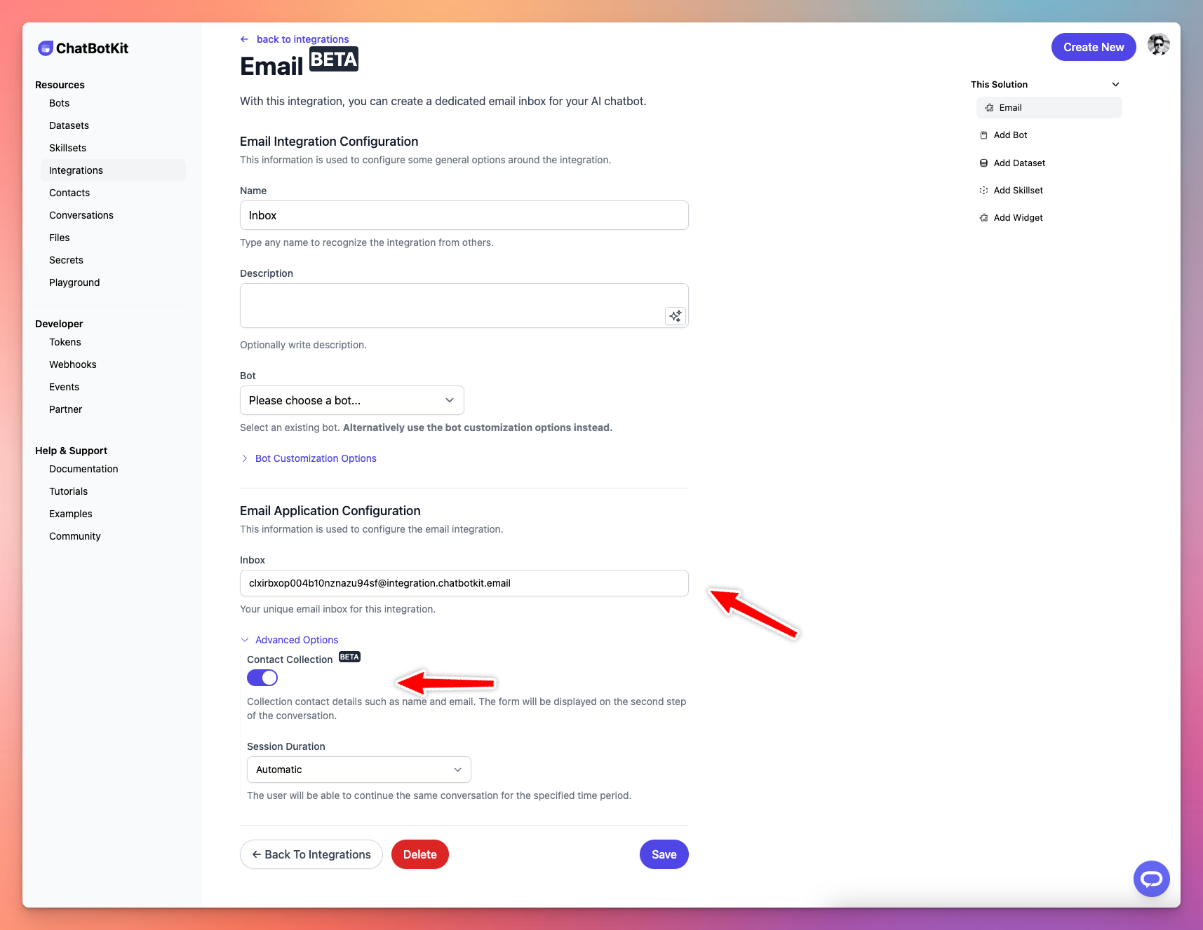 Alongside the Email Integration, ChatBotKit has enhanced its Contacts feature, which now supports both manual and automatic creation of contact profiles. This development is integrated across various platform tools, including email and widget interactions, providing businesses with robust tools to collect and manage contact information effectively.