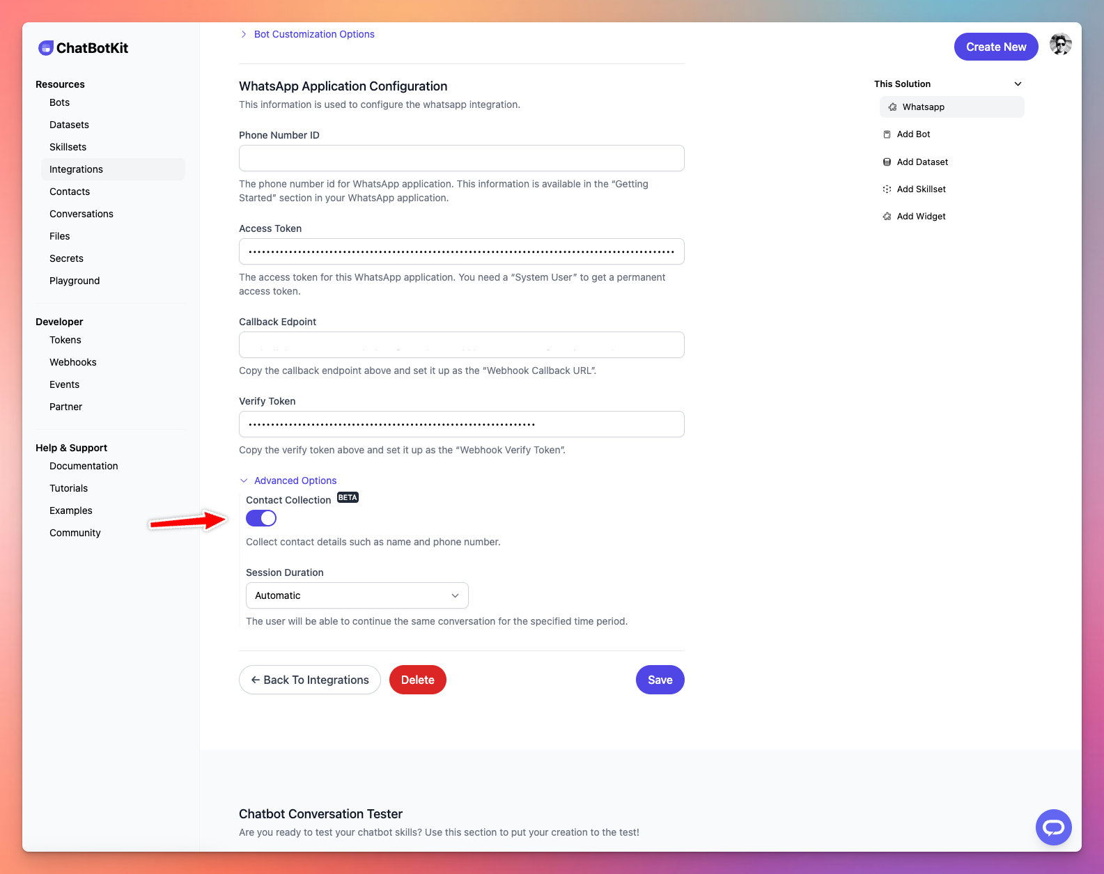 To enable the Contact Collection feature, customers can visit their ChatBotKit WhatsApp Integration settings where they can activate this option and start benefiting from a more organized and insightful customer interaction system.
