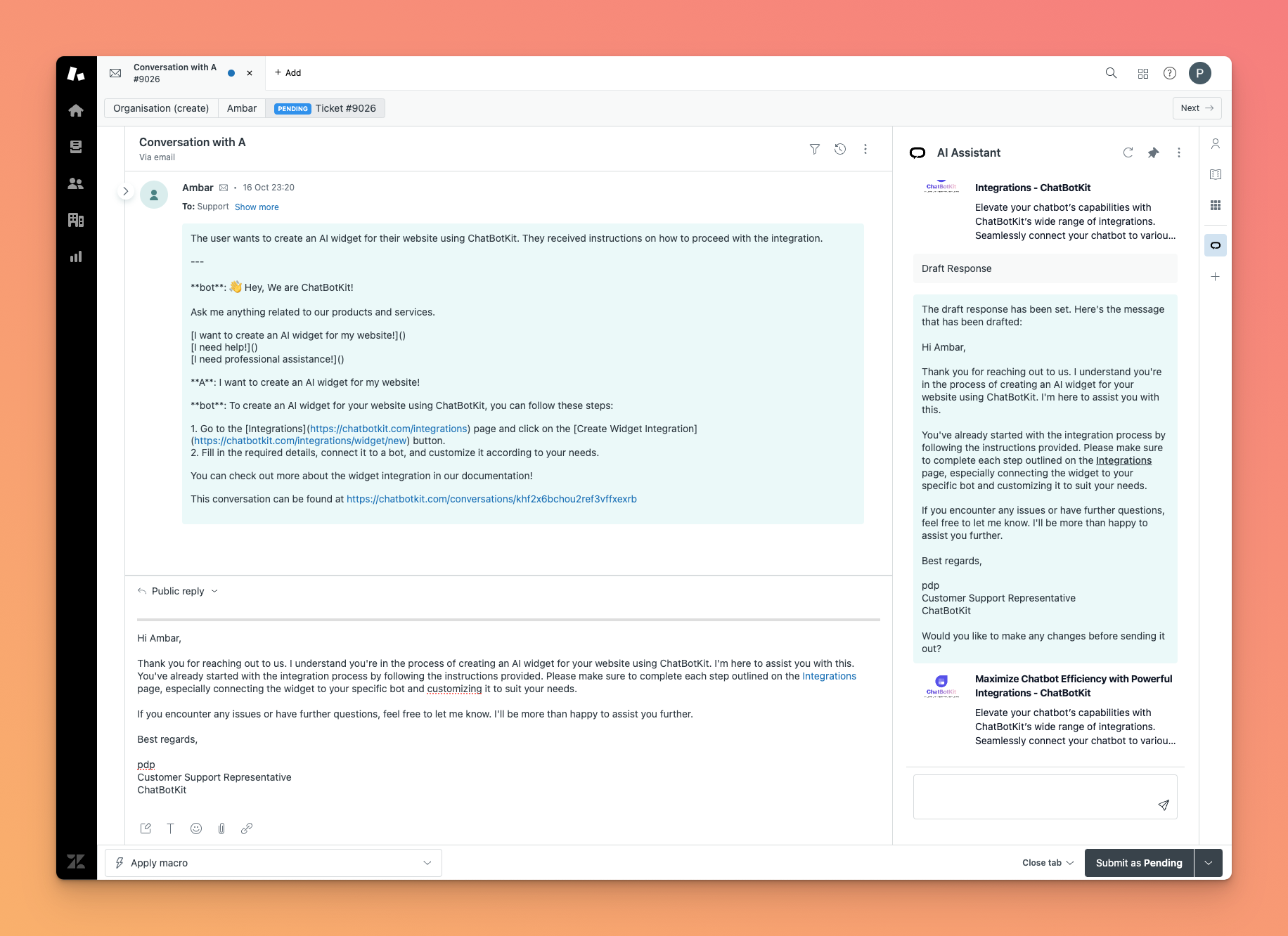 Designed to seamlessly integrate with the ChatBotKit AI Widget, the AI Assistant offers businesses the ability to enhance their customer support quality and efficiency significantly. Once the AI Widget is created, it can be quickly configured in the AI Assistant configuration page, allowing Zendesk agents to automate workflows and respond to tickets faster.