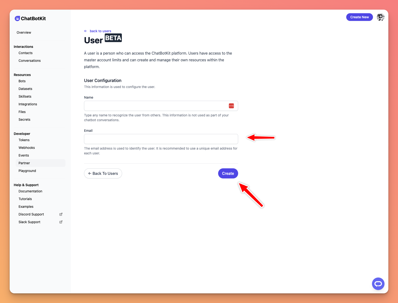 Upon logging in, your customers can access their sub-accounts, which you've created as the partner. You retain full management rights over these accounts. While your customers interact directly with you, ChatBotKit handles technical support issues like bug fixes, alleviating this responsibility from you.