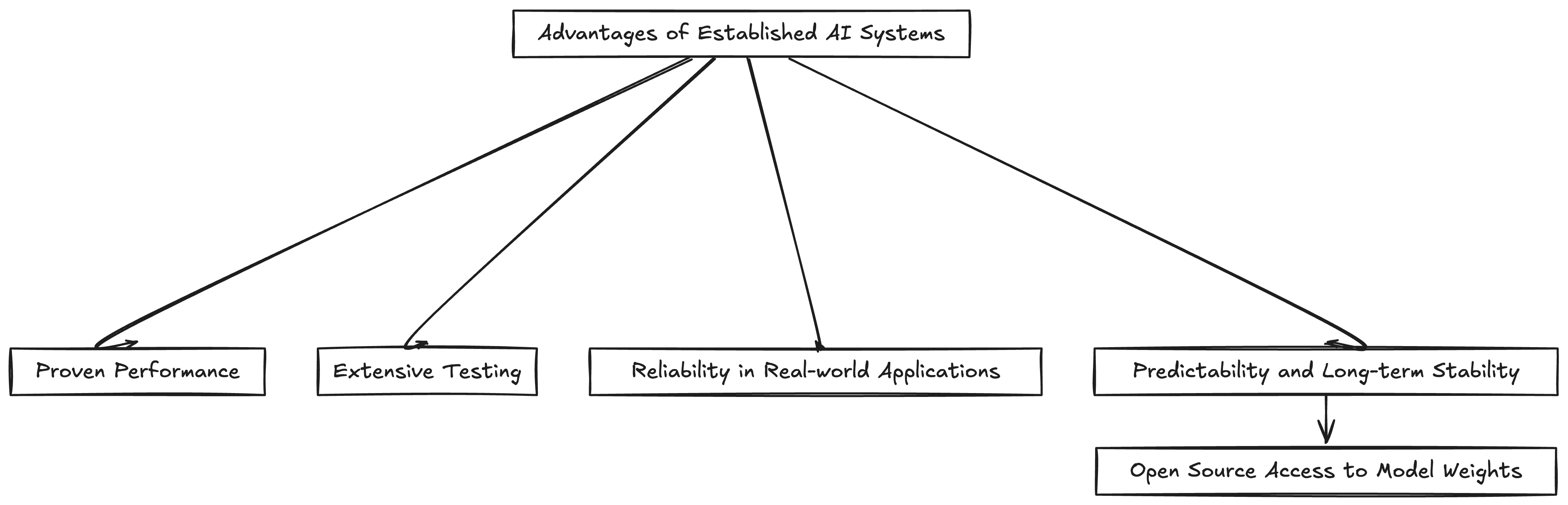 A balanced approach that considers the proven efficacy of existing solutions alongside the potential of newer models is essential. By prioritizing the use of tried and tested models, organizations can ensure a more stable and predictable AI performance. They can benefit from the accumulated knowledge and best practices associated with these established systems, reducing the risk of unexpected failures and ensuring a smoother implementation process.